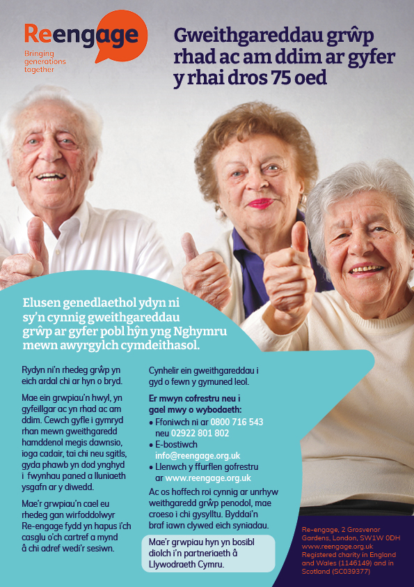 Nod Re-engage yw helpu pobl 75 oed a hŷn i osgoi a goresgyn unigedd ac unigrwydd drwy ddatblygu grwpiau cymdeithasol am ddim sy'n cyfarfod yn rheolaidd a lle gall pobl hŷn ddod i adnabod cyfoedion a phobl eraill yn eu cymuned...